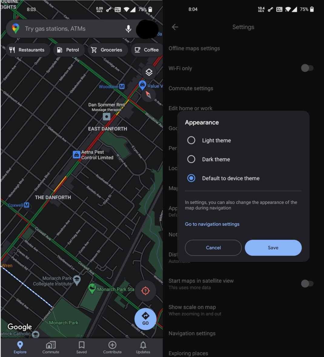 Obwohl Google Maps zunächst nur auf erschien UNS Wenn Sie das Design-Update erhalten, können Sie jetzt den Dunkelmodus verwenden – auch wenn dies nicht in der gesamten App der Fall ist. Dazu müssen Sie rechts in der Suchleiste oben auf dem Bildschirm auf Ihr Profil tippen. Dann öffnet sich ein Fenster, in dem Sie auf „Einstellungen“ tippen. Sie können die Anzeige der Karte über „Navigationseinstellungen“ ändern und zu „Nacht“ wechseln. Dies bedeutet, dass die normale Kartenansicht in Google Maps nicht dunkel ist. Aber fängst du an? SegelnDu hast einen dunklen Weg.